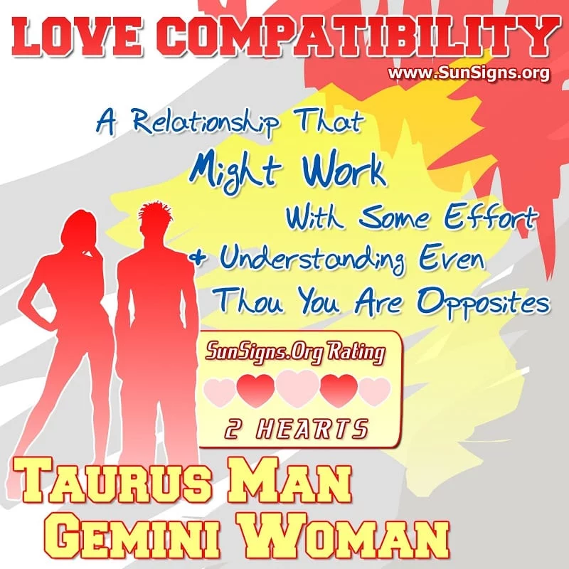 Taurus is an earth sign that is fixed and Gemini is an air sign that is mutable by nature. The Taurus man Gemini woman compatibility gets a TWO Hearts love rating. The match will both have to work hard at compromise if they want to make this relationship last long.