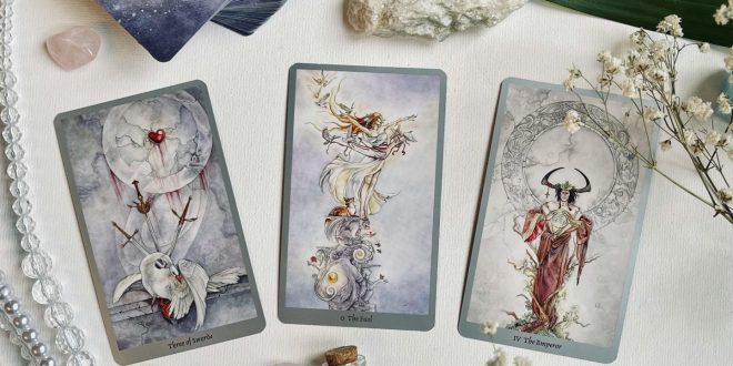 Today, I am going to share my three-card tarot spread of the day. My technique for a card Tarot Spread is to draw one card from each of my three tarot decks: the Gilded, the Deviant Moon, and the Fenestra using these meanings for each card: