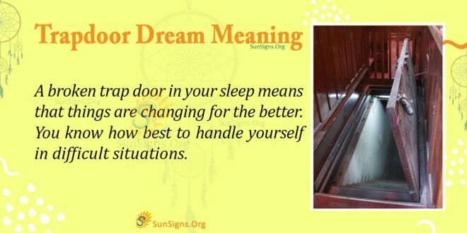 According to the trap doors dream dictionary, dreaming of a trap door signifies being open with your feelings and emotions. Stop hiding from people. Express yourself, and people will relate to what is happening in your life and help you out. Deal with all the issues you have been avoiding, and all will be well.