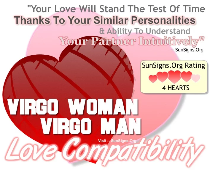 Virgo is a mutable earth sign, the Virgo woman Virgo man compatibility gets a FOUR Hearts rating. The shared calm disposition between the couple should keep arguments at a minimum, and they are always able to talk it out in the end. This zodiac match between two similar people is always pleasant.